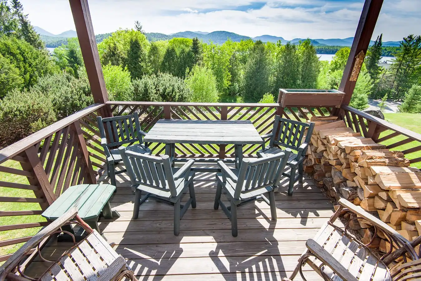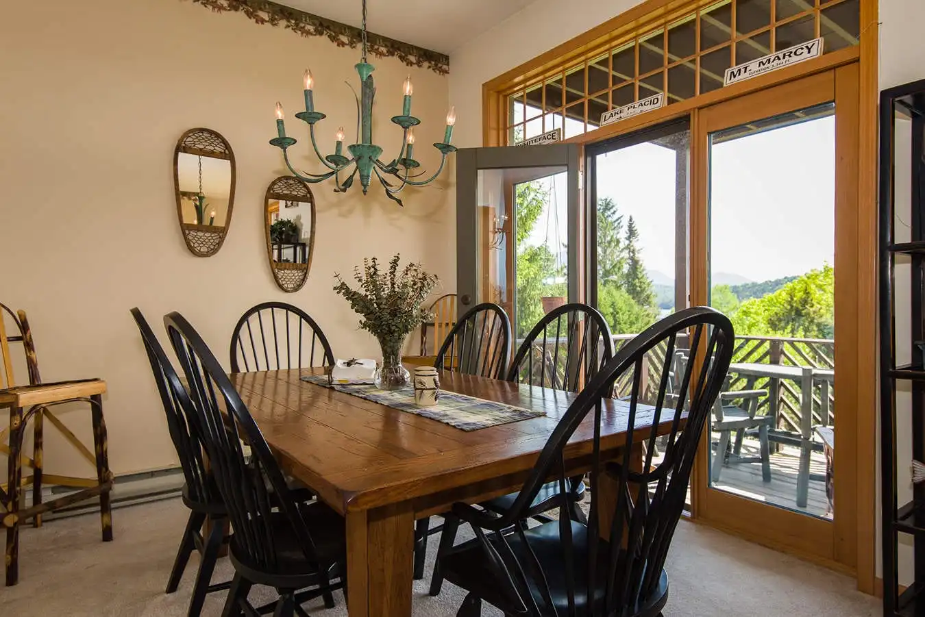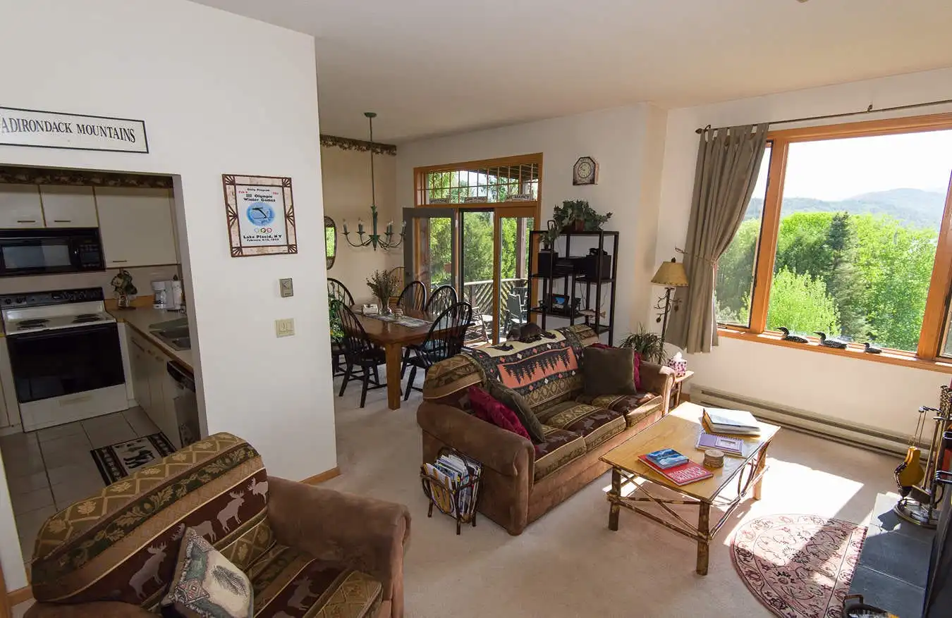 It has a very comfortable queen bed in the master BR, 2 twins and bunk beds in the other plus a sleeper sofa in the LR. There are TVs in both BR’s plus the living room, hand stenciled ADK themed borders and Olympic prints. Two large themed full bathrooms (pine cones & oak leaves), a fully equipped kitchen and a very cozy living room with a fireplace (we supply the wood), perfect for relaxing and with stunning views of the lake and surrounding mountains. ADK furniture and plush carpeting with hand picked ADK decorations throughout. An open dining area that seats 6 leads to our deck with GREAT views of Lake Placid, Whiteface Mountain and the Sentinal Range. You can see the bobsled & luge tracks plus the moon and sunrise from it too. Wireless internet, a Smart TV, 40 DVDs, 20 board games & many jigsaw puzzles for family fun. Easy walk-in access from private parking to this peaceful yet centrally located retreat. Perfect for young children or seniors!