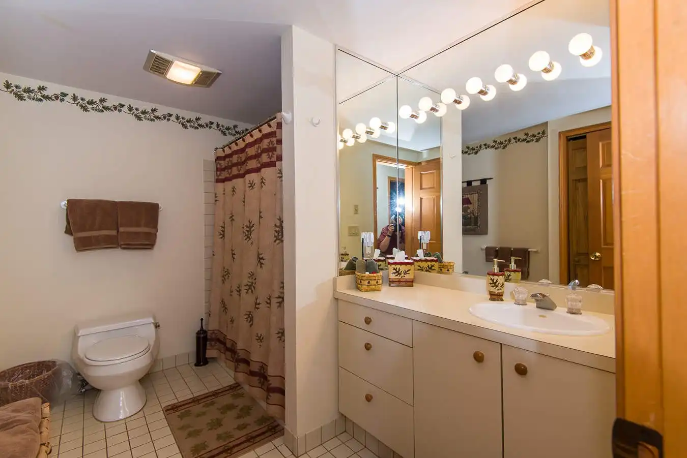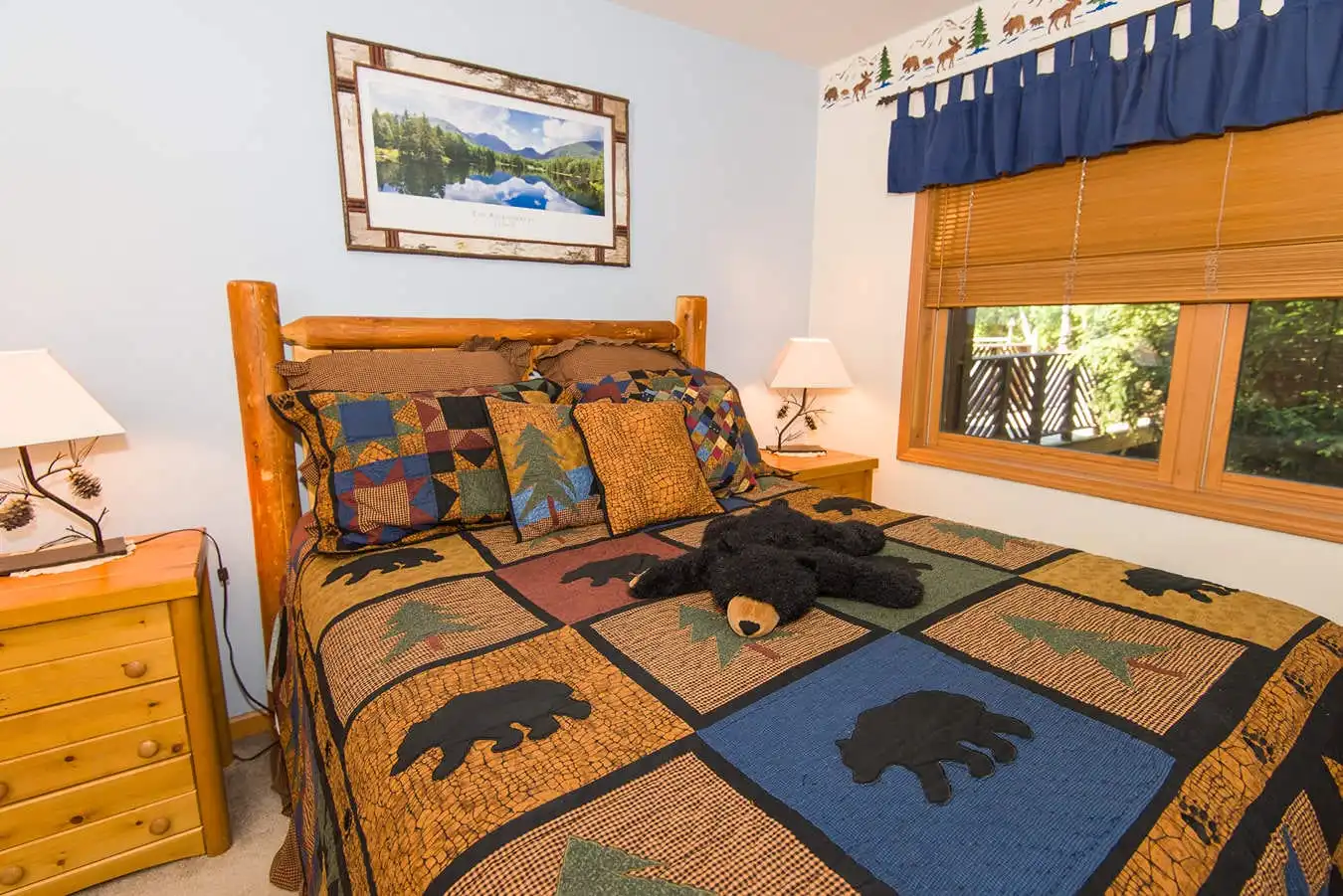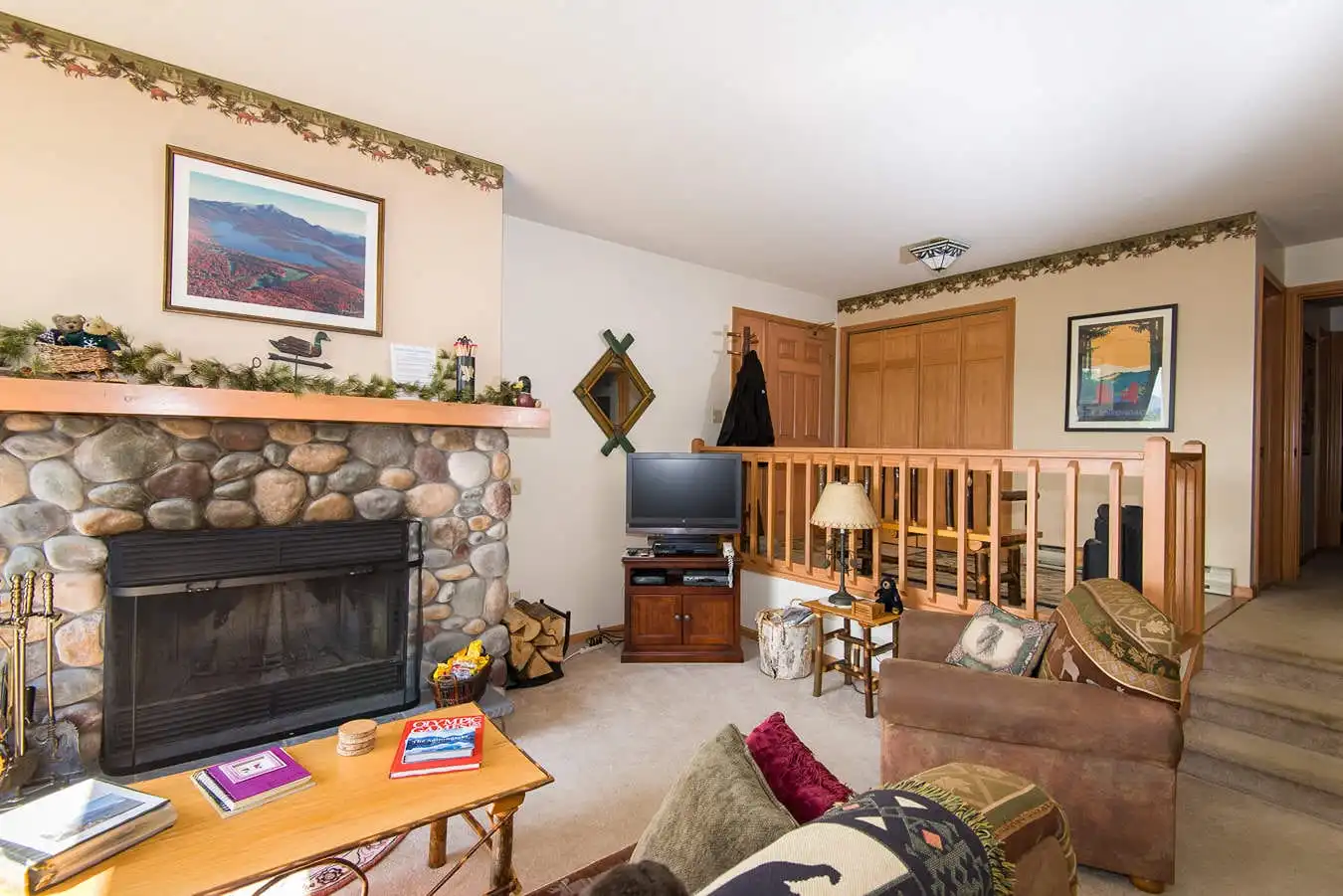 It has a very comfortable queen bed in the master BR, 2 twins and bunk beds in the other plus a sleeper sofa in the LR. There are TVs in both BR’s plus the living room, hand stenciled ADK themed borders and Olympic prints. Two large themed full bathrooms (pine cones & oak leaves), a fully equipped kitchen and a very cozy living room with a fireplace (we supply the wood), perfect for relaxing and with stunning views of the lake and surrounding mountains. ADK furniture and plush carpeting with hand picked ADK decorations throughout. An open dining area that seats 6 leads to our deck with GREAT views of Lake Placid, Whiteface Mountain and the Sentinal Range. You can see the bobsled & luge tracks plus the moon and sunrise from it too. Wireless internet, a Smart TV, 40 DVDs, 20 board games & many jigsaw puzzles for family fun. Easy walk-in access from private parking to this peaceful yet centrally located retreat. Perfect for young children or seniors!
